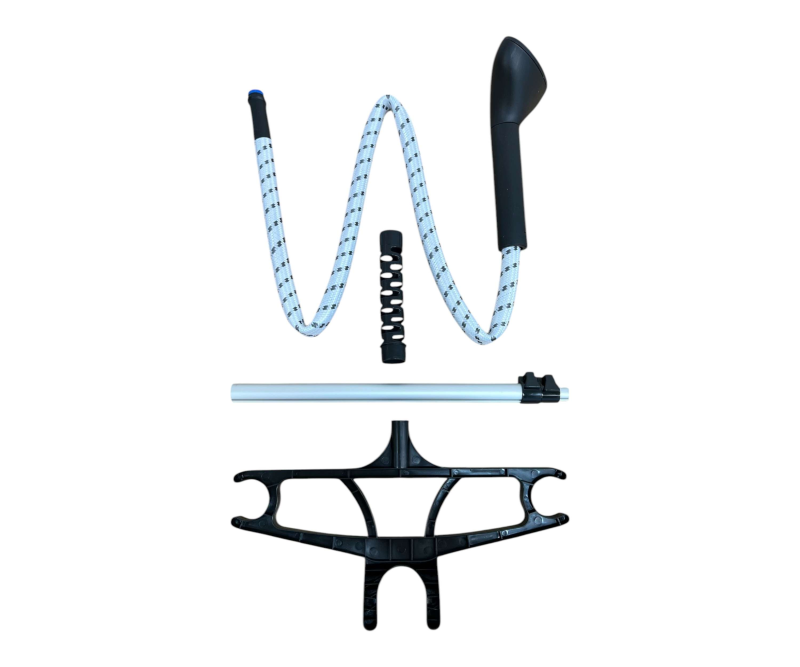 Ergonomic and adjustable design thanks to the telescopic pole and the integrated multi-use hanger