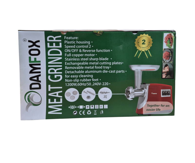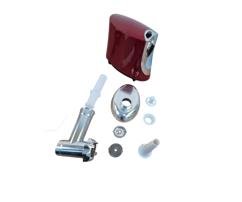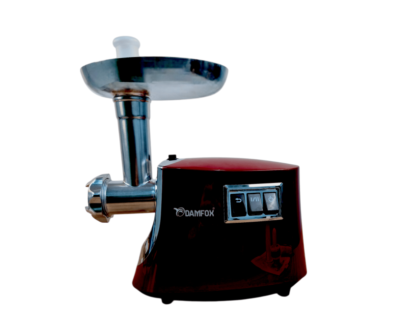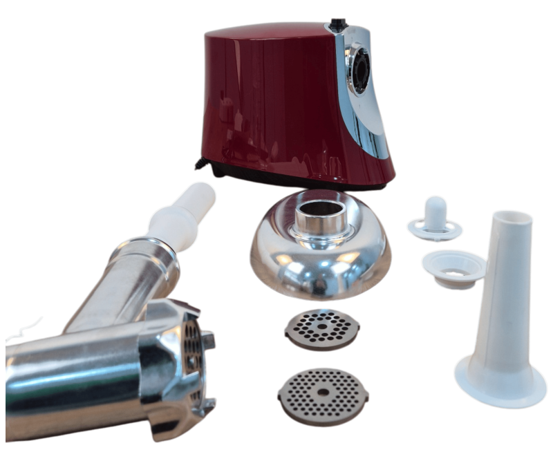 A multi-purpose electric meat grinder designed for quick and easy home use, grinding meat and preparing kebabs and sausages.
