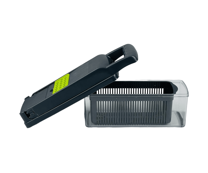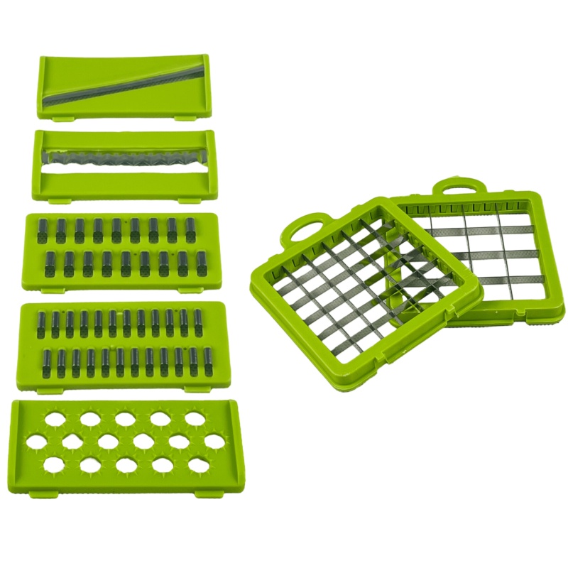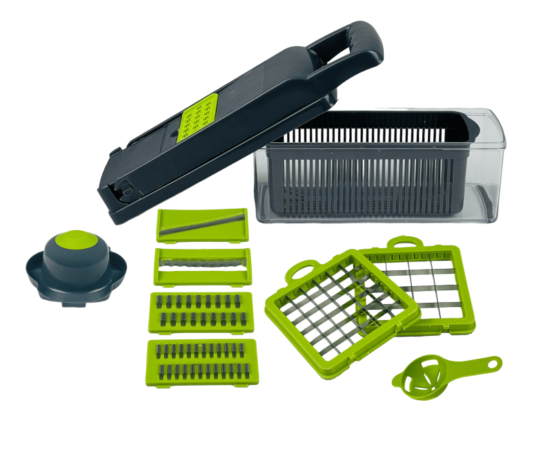 مجموعة متنوعة من الشفرات والأدوات. يمكنك استخدامها لتقطيع الخضروات إلى شرائح رقيقة، أعواد صغيرة، شرائح سميكة، قطع مكعبات، وحتى تقطيع الخضروات إلى شرائح مموجة